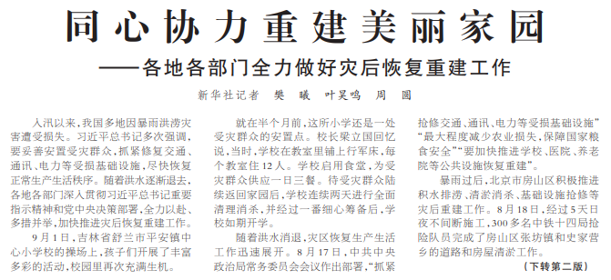 入汛以来,我国多地因暴雨洪涝灾害遭受损失。习近平总书记多次强调,要妥善安置受灾群众,抓紧修复交通、通讯、电力等受损基础设施,尽快恢复正常生产生活秩序。随着洪水逐渐退去,各地各部门深入贯彻习近平总书记重要指示精神和党中央决策部署,全力以赴、多措并举,加快推进灾后恢复重建工作。(今日《人民日报》1版、2版)