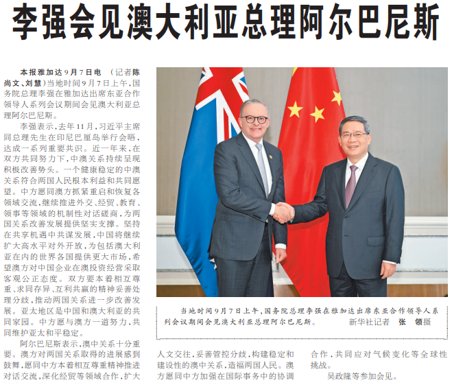 当地时间9月7日上午,国务院总理李强在雅加达出席东亚合作领导人系列会议期间会见澳大利亚总理阿尔巴尼斯。(今日《人民日报》3版)