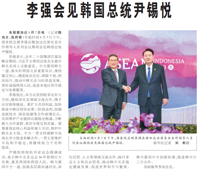 当地时间9月7日下午,国务院总理李强在雅加达出席东亚合作领导人系列会议期间会见韩国总统尹锡悦。(今日《人民日报》3版)