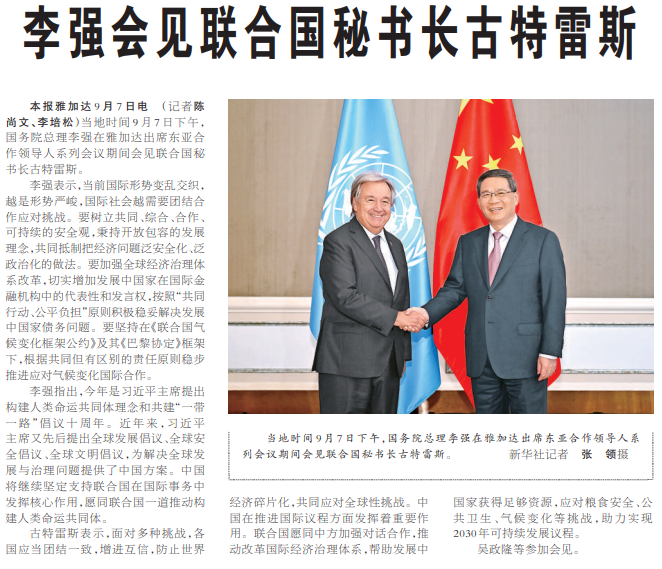 当地时间9月7日下午,国务院总理李强在雅加达出席东亚合作领导人系列会议期间会见联合国秘书长古特雷斯。(今日《人民日报》3版)