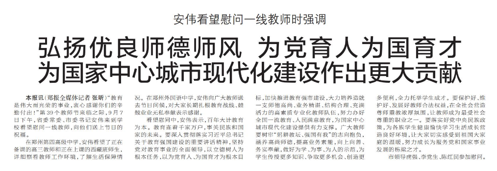 “教育是伟大而光荣的事业,衷心感谢你们的辛勤付出!”第39个教师节来临之际,9月7日下午,省委常委、市委书记安伟来到学校看望慰问一线教师,向他们送上节日的祝福。(今日《郑州日报》1版)