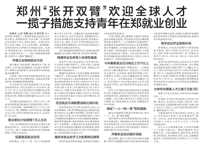 第六届中国·河南招才引智创新发展大会将在这个秋天举行,郑州将再次“张开双臂”,以实实在在的举措对全球人才表示欢迎。记者昨日从市人社局了解到,今年,我市实施一系列措施,支持高校毕业生等青年在郑就业创业。这其中,既有就业补贴,又有创业补贴;既有住房优惠,又有就业帮扶……一揽子满满诚意的措施,为青年人才抛出“橄榄枝”。(今日《郑州日报》2版)