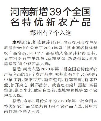 河南新增39个全国名特优新农产品