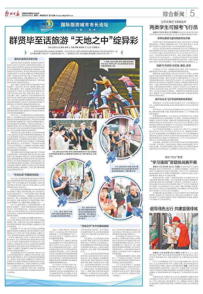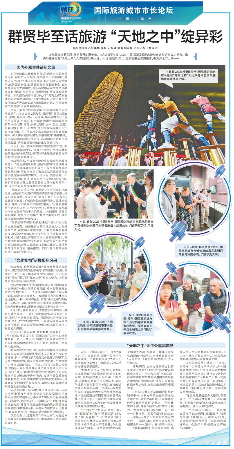 文化因交流而多彩,旅游因互动而繁荣。9月3日至6日,2023中国(郑州)国际旅游城市市长论坛成功举办。海内外嘉宾相聚“天地之中”,共谋旅游发展大计。一场场旅游、文化、经济交融的思想盛宴,在黄河之滨上演——(今日《郑州日报》5版)