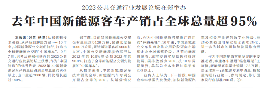 从探索到技术引领,从产品到解决方案……10年来,中国新能源公交砥砺前行,打造出全球新能源公交的“中国样本”。9月7日,记者从在郑州举办的2023公共交通行业发展论坛上获悉,作为“中国制造”的优秀代表,2022年,中国新能源客车产销量已占到全球总量的95%以上,出口量超7000辆,同比增长超过140%。(今日《河南日报》3版)