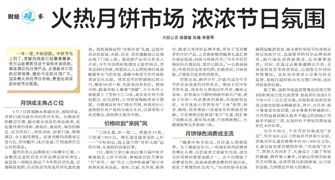 一年一度,中秋团圆。中秋节马上到了,灵敏的商家已经摩拳擦掌,全力以赴要抓住这个金秋市场良机,琳琅满目的月饼产品、占据超市C位的月饼地堆、随处可见的月饼广告,渲染着火热的节日市场,营造出浓浓的中秋节日氛围。(今日《郑州日报》6版)