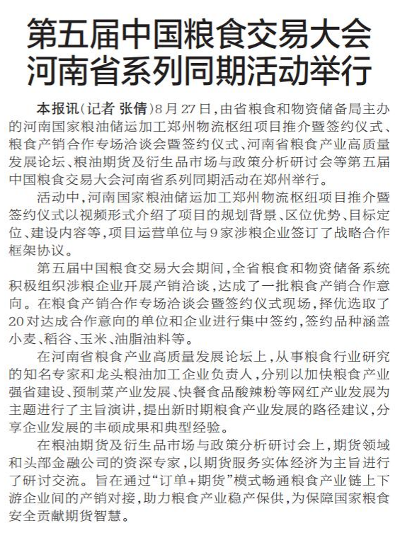 8月27日,由省粮食和物资储备局主办的河南国家粮油储运加工郑州物流枢纽项目推介暨签约仪式、粮食产销合作专场洽谈会暨签约仪式、河南省粮食产业高质量发展论坛、粮油期货及衍生品市场与政策分析研讨会等第五届中国粮食交易大会河南省系列同期活动在郑州举行。(今日《郑州日报》1版)