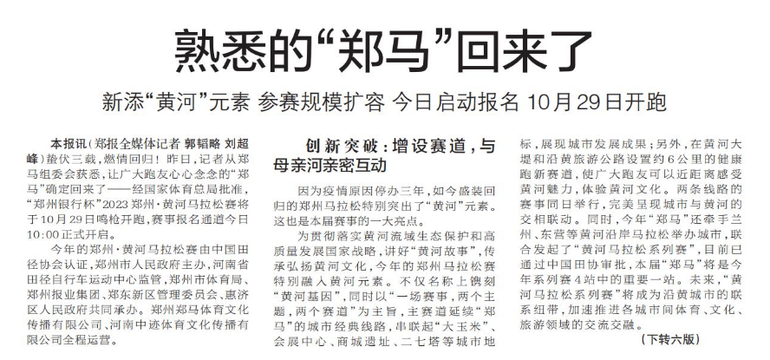 蛰伏三载,燃情回归!昨日,记者从郑马组委会获悉,让广大跑友心心念念的“郑马”确定回来了——经国家体育总局批准,“郑州银行杯”2023郑州·黄河马拉松赛将于10月29日鸣枪开跑,赛事报名通道今日10:00正式开启。(今日《郑州日报》1版、6版)