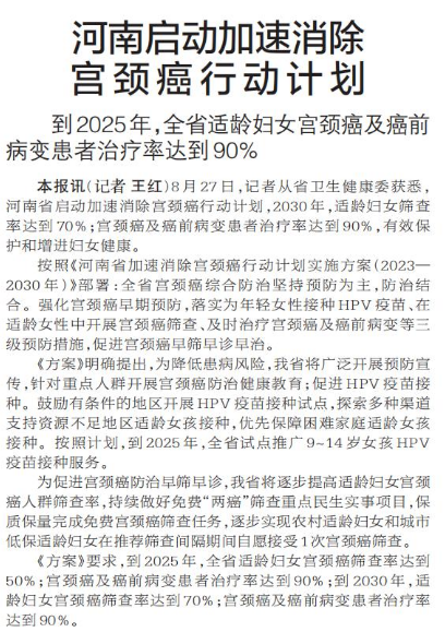 8月27日,记者从省卫生健康委获悉,河南省启动加速消除宫颈癌行动计划,2030年,适龄妇女筛查率达到70%;宫颈癌及癌前病变患者治疗率达到90%,有效保护和增进妇女健康。(今日《郑州日报》2版)