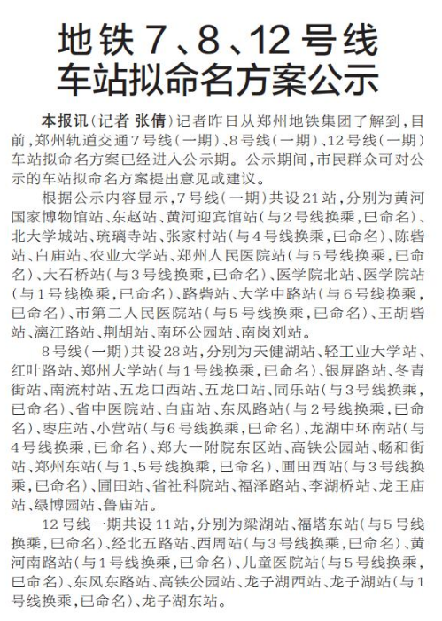 记者昨日从郑州地铁集团了解到,目前,郑州轨道交通7号线(一期)、8号线(一期)、12号线(一期)车站拟命名方案已经进入公示期。公示期间,市民群众可对公示的车站拟命名方案提出意见或建议。(今日《郑州日报》2版)