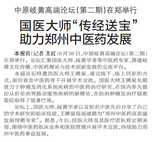 8月26日,中原岐黄高端论坛(第二期)在郑举行。论坛汇聚国医大师、岐黄学者等中医药专家,搭建岐黄文化传播、中医药理论与技术创新发展的交流平台。(今日《郑州日报》2版)