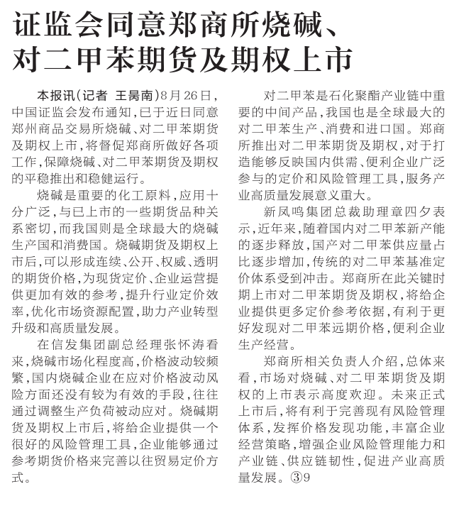8月26日,中国证监会发布通知,已于近日同意郑州商品交易所烧碱、对二甲苯期货及期权上市,将督促郑商所做好各项工作,保障烧碱、对二甲苯期货及期权的平稳推出和稳健运行。(今日《河南日报》2版)