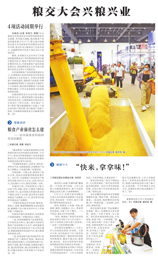 “河南粮食体量大、品种全、调出多,育种水平高,设施装备强,河南粮食产业加工规模大,产业链完整。”田建民说。(今日《河南日报》2版)