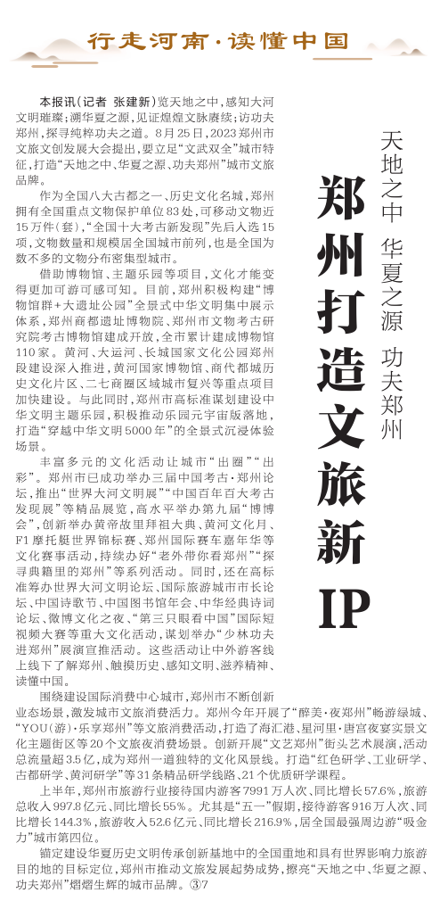 览天地之中,感知大河文明璀璨;溯华夏之源,见证煌煌文脉赓续;访功夫郑州,探寻纯粹功夫之道。8月25日,2023郑州市文旅文创发展大会提出,要立足“文武双全”城市特征,打造“天地之中、华夏之源、功夫郑州”城市文旅品牌。