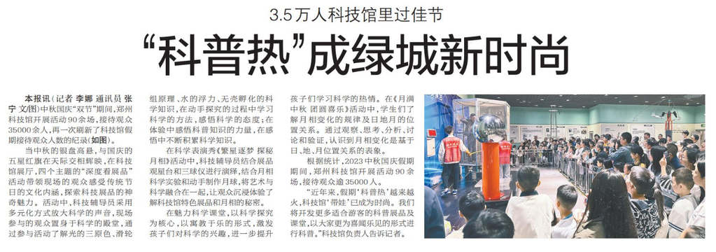 中秋国庆“双节”期间,郑州科技馆开展活动90余场,接待观众35000余人,再一次刷新了科技馆假期接待观众人数的纪录。(今日《郑州日报》2版)