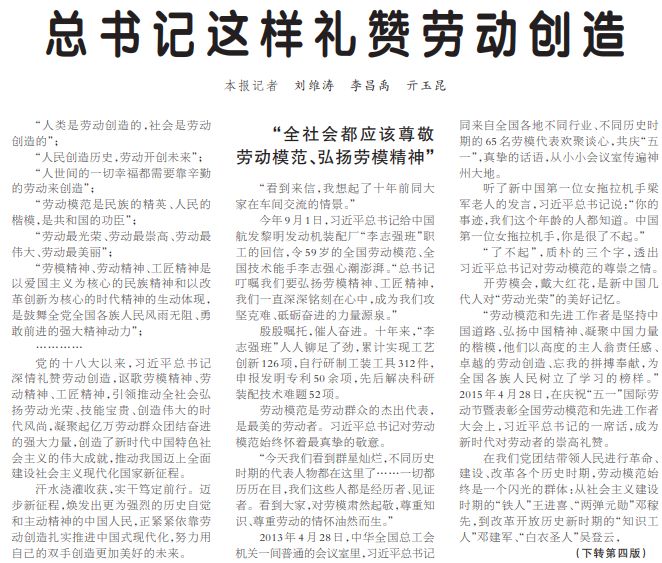 党的十八大以来,习近平总书记深情礼赞劳动创造,讴歌劳模精神、劳动精神、工匠精神,引领推动全社会弘扬劳动光荣、技能宝贵、创造伟大的时代风尚,凝聚起亿万劳动群众团结奋进的强大力量,创造了新时代中国特色社会主义的伟大成就,推动我国迈上全面建设社会主义现代化国家新征程。(今日《人民日报》1版、4版)