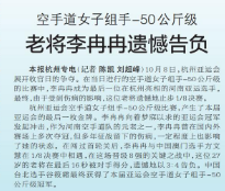 10月8日,杭州亚运会展开收官日的争夺。在当日进行的空手道女子组手-50公斤级的比赛中,李冉冉成为最后一位在杭州亮相的河南亚运选手。最终,由于受到伤病的影响,这位老将遗憾地止步1/8决赛。(今日《郑州日报》6版)