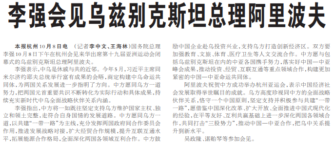 国务院总理李强10月8日下午在杭州会见来华出席第十九届亚洲运动会闭幕式的乌兹别克斯坦总理阿里波夫。(今日《人民日报》3版)