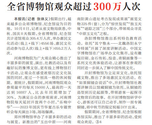 假期出行,越来越多公众将博物馆、纪念馆设为目的地。10月8日,记者从省文物局获悉,中秋、国庆8天假期,全省博物馆、纪念馆共计进馆观众305.4万人次,举办惠民文化活动(线上+线下)4556场、惠民文化活动参与总人次(线上+线下)655.2万人次。(今日《河南日报》2版)