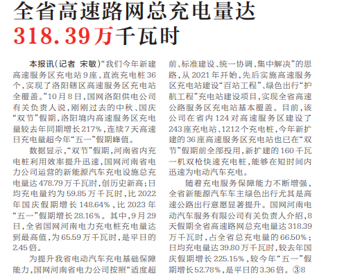 “我们今年新建高速服务区充电站9座、直流充电桩36个,实现了洛阳辖区高速服务区充电站全覆盖。”10月8日,国网洛阳供电公司有关负责人说,刚刚过去的中秋、国庆“双节”假期,洛阳境内高速服务区充电量较去年同期增长217%,连续7天高速日充电量超今年“五一”假期峰值。(今日《河南日报》2版)