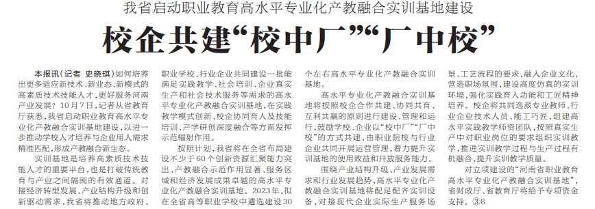 如何培养出更多适应新技术、新业态、新模式的高素质技术技能人才,更好服务河南产业发展?10月7日,记者从省教育厅获悉,我省启动职业教育高水平专业化产教融合实训基地建设,以进一步推动学校人才培养与企业用人需求精准匹配,形成产教融合新生态。(今日《河南日报》2版)