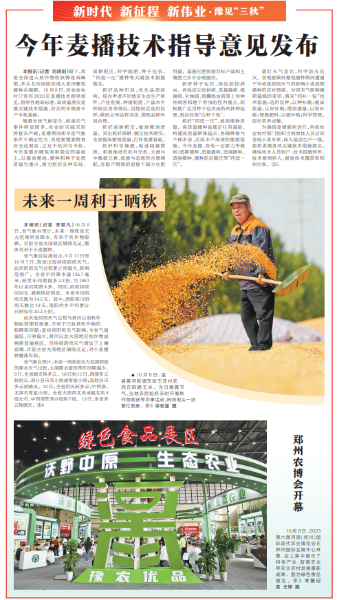 10月8日,省气象台预计,未来一周我省无大范围明显降水,有利于秋作物晾晒。目前全省大部地区墒情充足,整体有利于小麦播种。(今日《河南日报》2版)