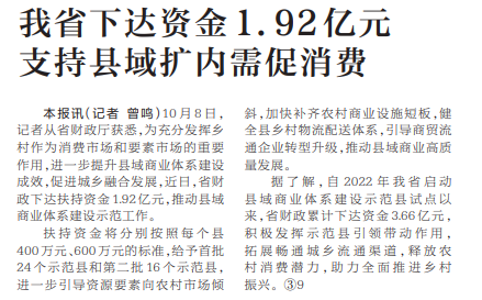 我省下达资金1.92亿元支持县域扩内需促消费