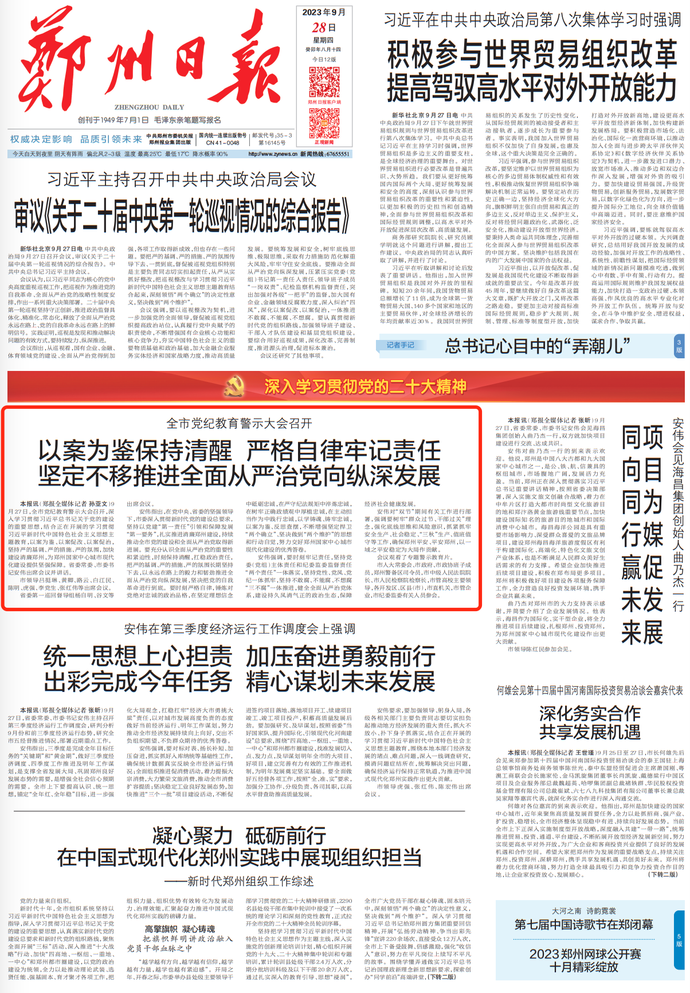 9月27日,全市党纪教育警示大会召开,深入学习贯彻习近平总书记关于党的建设的重要思想,结合正在开展的学习贯彻习近平新时代中国特色社会主义思想主题教育,以案为鉴、以案促改、以案促治,坚持严的基调、严的措施、严的氛围,加快建设清廉郑州,为郑州国家中心城市现代化建设提供坚强保障。省委常委、市委书记安伟出席会议并讲话。