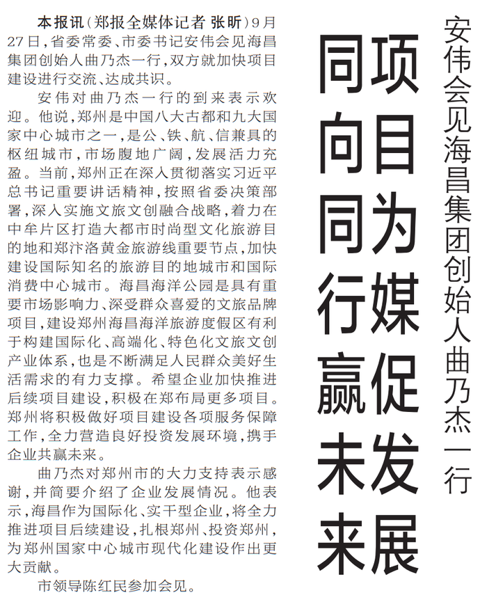 安伟对曲乃杰一行的到来表示欢迎。他说,郑州是中国八大古都和九大国家中心城市之一,是公、铁、航、信兼具的枢纽城市,市场腹地广阔,发展活力充盈。当前,郑州正在深入贯彻落实习近平总书记重要讲话精神,按照省委决策部署,深入实施文旅文创融合战略,着力在中牟片区打造大都市时尚型文化旅游目的地和郑汴洛黄金旅游线重要节点,加快建设国际知名的旅游目的地城市和国际消费中心城市。海昌海洋公园是具有重要市场影响力、深受群众喜爱的文旅品牌项目,建设郑州海昌海洋旅游度假区有利于构建国际化、高端化、特色化文旅文创产业体系,也是不断满足人民群众美好生活需求的有力支撑。希望企业加快推进后续项目建设,积极在郑布局更多项目。郑州将积极做好项目建设各项服务保障工作,全力营造良好投资发展环境,携手企业共赢未来。(今日《郑州日报》1版)
