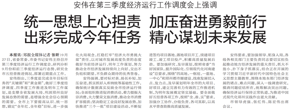 安伟指出,三季度是完成全年目标任务的“关键期”和“黄金期”,做好三季度经济调度、四季度工作推进及明年工作谋划,是支撑全省发展大局、巩固郑州良好发展态势的需要,是增强全社会信心预期的需要。全市上下要提高认识、统一思想,锚定“全年红、全年稳”目标,进一步强化大局观念,扛稳扛牢“经济大市勇挑大梁”责任,以对城市发展高度负责的态度做好当前经济运行、明年工作谋划,努力推动全市经济发展持续向上向好,交出不负组织期望、不负群众期待的优秀答卷。(今日《郑州日报》1版)