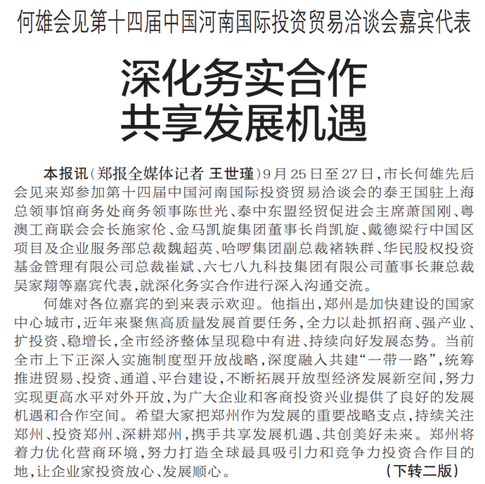 9月25日至27日,市长何雄先后会见来郑参加第十四届中国河南国际投资贸易洽谈会的泰王国驻上海总领事馆商务处商务领事陈世光、泰中东盟经贸促进会主席萧国刚、粤澳工商联会会长施家伦、金马凯旋集团董事长肖凯旋、戴德梁行中国区项目及企业服务部总裁魏超英、哈啰集团副总裁褚轶群、华民股权投资基金管理有限公司总裁崔斌、六七八九科技集团有限公司董事长兼总裁吴家翔等嘉宾代表,就深化务实合作进行深入沟通交流。(今日《郑州日报》1版、2版)