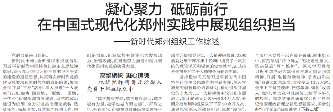 新时代十年,全市组织系统坚持以习近平新时代中国特色社会主义思想为指导,深入学习贯彻习近平总书记关于党的建设的重要思想,认真落实新时代党的建设总要求和新时代党的组织路线,聚焦全面开展“三标”活动、深入推进“十大战略”行动、加快“四高地、一枢纽、一重地、一中心”和郑州都市圈建设,以党的政治建设为统领,全力以赴推动理论武装、选贤任能、强基固本、育才聚才各项工作,把组织力量、组织优势有效转化为发展动力、治理效能,汇聚起奋力推进中国式现代化郑州实践的磅礴力量。(今日《郑州日报》1版、2版)