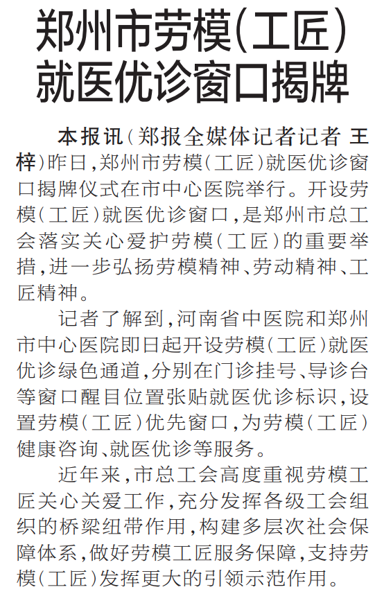 昨日,郑州市劳模(工匠)就医优诊窗口揭牌仪式在市中心医院举行。开设劳模(工匠)就医优诊窗口,是郑州市总工会落实关心爱护劳模(工匠)的重要举措,进一步弘扬劳模精神、劳动精神、工匠精神。(今日《郑州日报》2版)