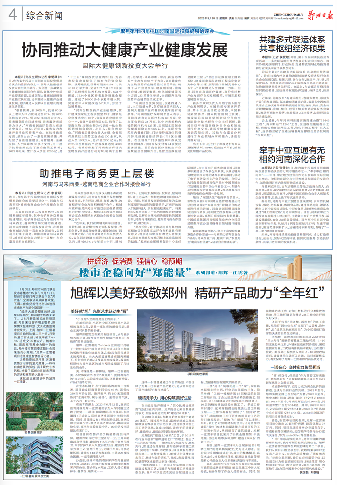 昨日,作为第十四届中国河南国际投资贸易洽谈会的重要内容之一,国际大健康创新投资大会在郑州举行。大会进一步凝聚卫生健康领域国际合作共识,聚集中外优质产业要素资源,加速国际大健康创新投资产业链互联互通,协同推动大健康产业健康发展,更好满足人民群众日益增长的健康生活需求。(今日《郑州日报》4版)