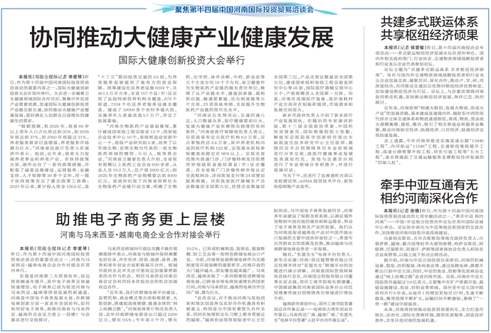 昨日,作为第十四届中国河南国际投资贸易洽谈会的重要活动之一,河南与马来西亚·越南电商企业合作对接会在郑州举行。(今日《郑州日报》4版)