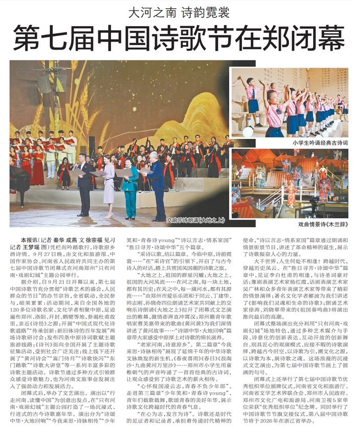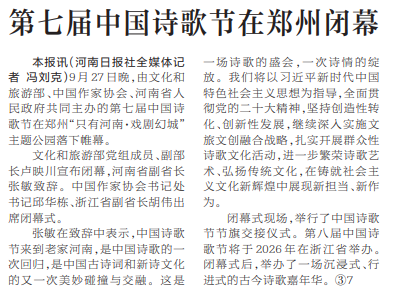 9月27日晚,由文化和旅游部、中国作家协会、河南省人民政府共同主办的第七届中国诗歌节在郑州“只有河南·戏剧幻城”主题公园落下帷幕。(今日《河南日报》2版)