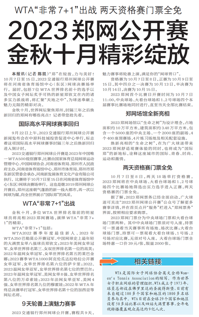 “郑”在绽放,力与美好!10月7日至15日,2023交通银行郑州网球公开赛将在河南省体育场馆中心(东区)网球决赛场举行。届时,包括7位WTA世界排名前十的选手以及中国女子网坛炙手可热的新星郑钦文在内的诸多实力派战将,将汇聚“天地之中”,为球迷奉献上魅力无限的精彩对决。(今日《郑州日报》5版)