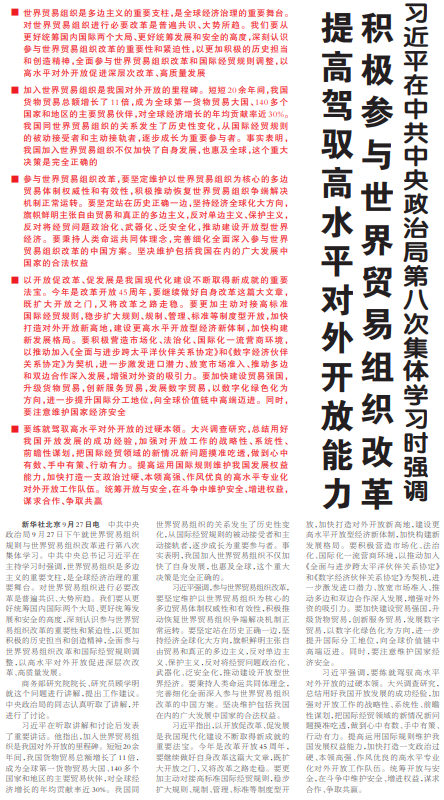 中共中央政治局9月27日下午就世界贸易组织规则与世界贸易组织改革进行第八次集体学习。中共中央总书记习近平在主持学习时强调,世界贸易组织是多边主义的重要支柱,是全球经济治理的重要舞台。对世界贸易组织进行必要改革是普遍共识、大势所趋。我们要从更好统筹国内国际两个大局、更好统筹发展和安全的高度,深刻认识参与世界贸易组织改革的重要性和紧迫性,以更加积极的历史担当和创造精神,全面参与世界贸易组织改革和国际经贸规则调整,以高水平对外开放促进深层次改革、高质量发展。(今日《人民日报》1版)