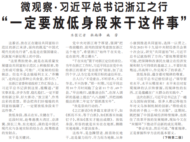 在浙江省委和省政府工作汇报会上,习近平总书记讲到这里,提醒道:“要实事求是、步步为营、稳扎稳打,一定不要有标新立异、好大喜功、‘放卫星’、作秀出彩的思想。那会把我们好端端的共同富裕搞砸了。一定要放低身段来干这件事。”(今日《人民日报》1版、2版)