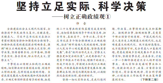 全面建设社会主义现代化国家,全面推进中华民族伟大复兴,关键在党,关键在人。习近平总书记近日在浙江考察时围绕坚持和加强党的全面领导、加强和改进党的建设提出明确要求,强调“树立正确政绩观,坚持立足实际、科学决策,坚持着眼长远、打牢基础,坚持干在实处、务求实效,防止形式主义、官僚主义”。(今日《人民日报》1版、2版)