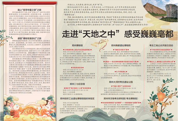 中原沃土,文化厚重;黄河之滨,风华“郑”茂。 郑州是我国百万年人类史、一万年文化史、八千年农业史、五千多年文明史的主要实证地之一,系统呈现了我国在新石器时代、青铜时代等多个历史时代的辉煌文明成果。郑州是中华文明的重要发祥地,也是中华文明五大特性的生动体现地,同时,还是一座“博物馆之城”。(今日《郑州日报》5版)