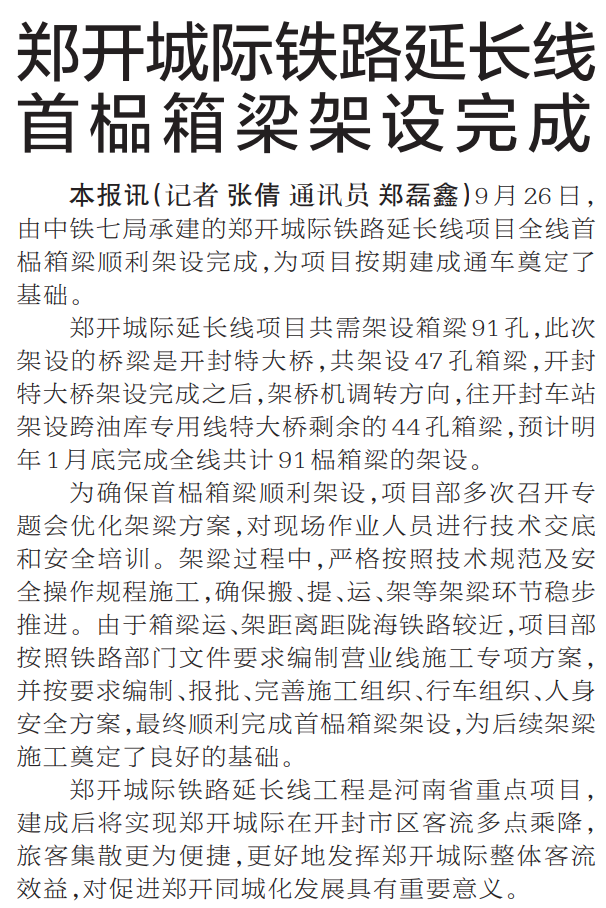 9月26日,由中铁七局承建的郑开城际铁路延长线项目全线首榀箱梁顺利架设完成,为项目按期建成通车奠定了基础。(今日《郑州日报》6版)