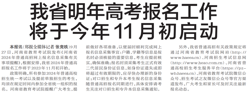 9月27日,河南省教育考试院发布《河南省2024年普通高招网上报名信息采集有关事项提醒》,根据安排,我省2024年普通高招报名工作将于2023年11月初开始。(今日《郑州日报》6版)