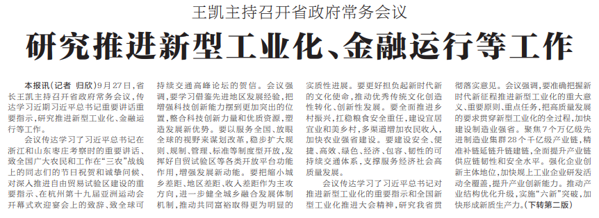 9月27日,省长王凯主持召开省政府常务会议,传达学习近期习近平总书记重要讲话重要指示,研究推进新型工业化、金融运行等工作。(今日《河南日报》1版、2版)