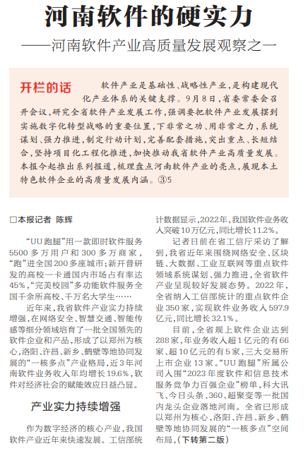 近年来,我省软件产业实力持续增强,在网络安全、智慧交通、智能传感等细分领域培育了一批全国领先的软件企业和产品,形成了以郑州为核心,洛阳、许昌、新乡、鹤壁等地协同发展的“一核多点”产业格局,近3年河南软件业务收入年均增长19.6%,软件对经济社会的赋能效应日益凸显。(今日《河南日报》1版、2版)