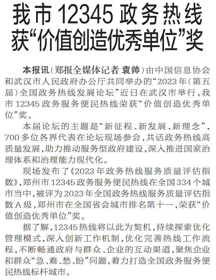 由中国信息协会和武汉市人民政府办公厅共同举办的“2023年(第五届)全国政务热线发展论坛”近日在武汉市举行,我市12345政务服务便民热线荣获“价值创造优秀单位”奖。(今日《郑州日报》6版)