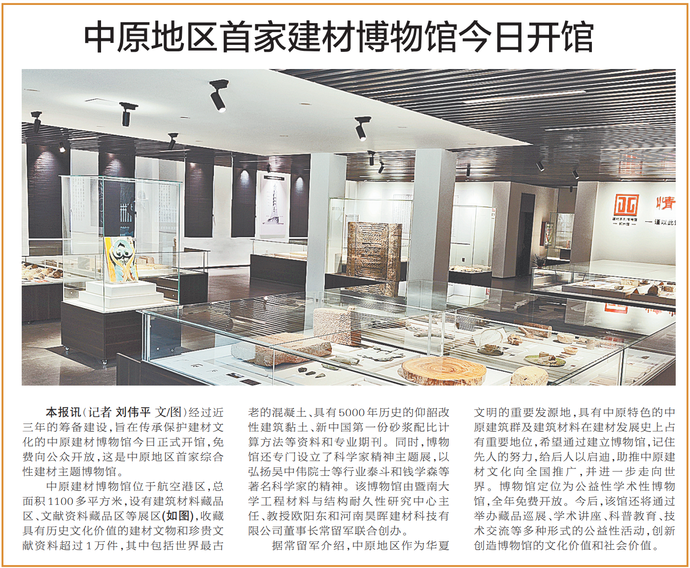 经过近三年的筹备建设,旨在传承保护建材文化的中原建材博物馆今日正式开馆,免费向公众开放,这是中原地区首家综合性建材主题博物馆。(今日《郑州日报》6版)