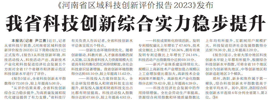 近日,记者从省科技厅获悉,《河南省区域科技创新评价报告2023》已正式发布。《报告》从科技创新环境、科技活动投入、科技活动产出、高新技术产业化和科技促进经济社会发展五个方面对全省17个省辖市和济源示范区科技创新水平进行了评价。(今日《河南日报》2版)