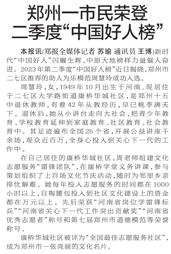 新时代“中国好人”闪耀生辉,中原大地榜样力量催人奋进。2023年第二季度“中国好人榜”近日揭晓,郑州市二七区推荐的助人为乐模范周慧玲成功入选。(今日《郑州日报》6版)