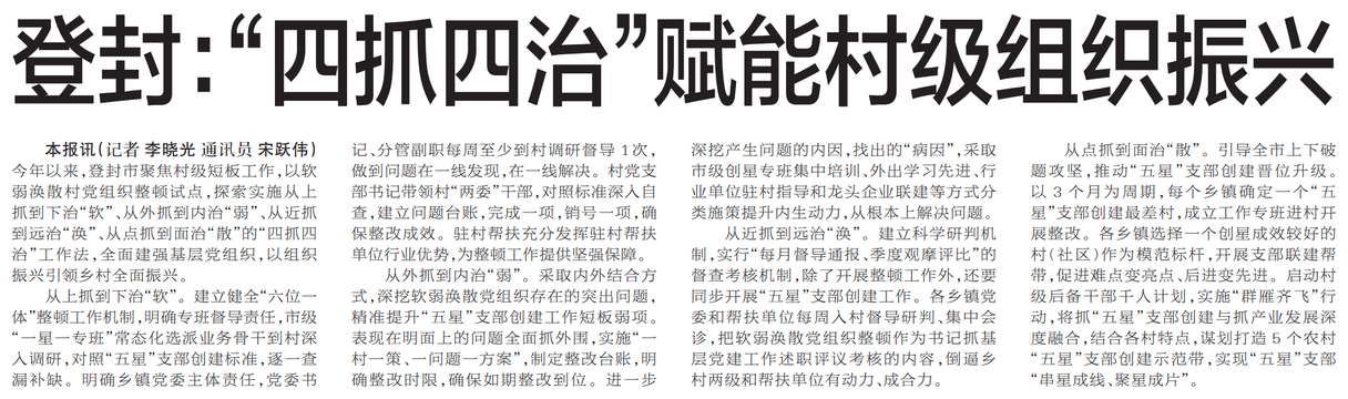今年以来,登封市聚焦村级短板工作,以软弱涣散村党组织整顿试点,探索实施从上抓到下治“软”、从外抓到内治“弱”、从近抓到远治“涣”、从点抓到面治“散”的“四抓四治”工作法,全面建强基层党组织,以组织振兴引领乡村全面振兴。(今日《郑州日报》7版)